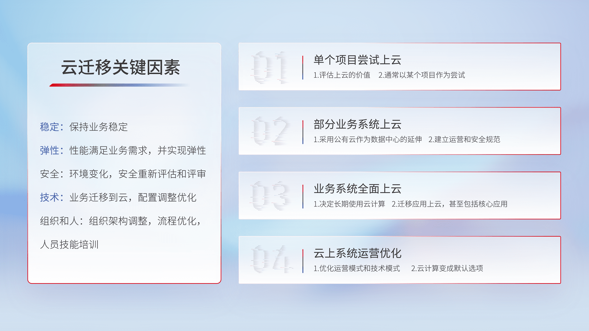 结合实际业务,,,从规划设计、、云平台选型、、、云原生改造、、数据迁移、、集成交付,,,迁移全过程为客户识别最佳上云路径,,,,做好风险识别管理,,,设计网络架构、、、身份权限、、安全审计合规、、操作审计、、日志审计、、监控告警策略、、多站点容灾设计等,,对云上基础设施进行整体规划,,提升IT治理水平,,以满足弹性、、高可用、、、高性能的需求。。