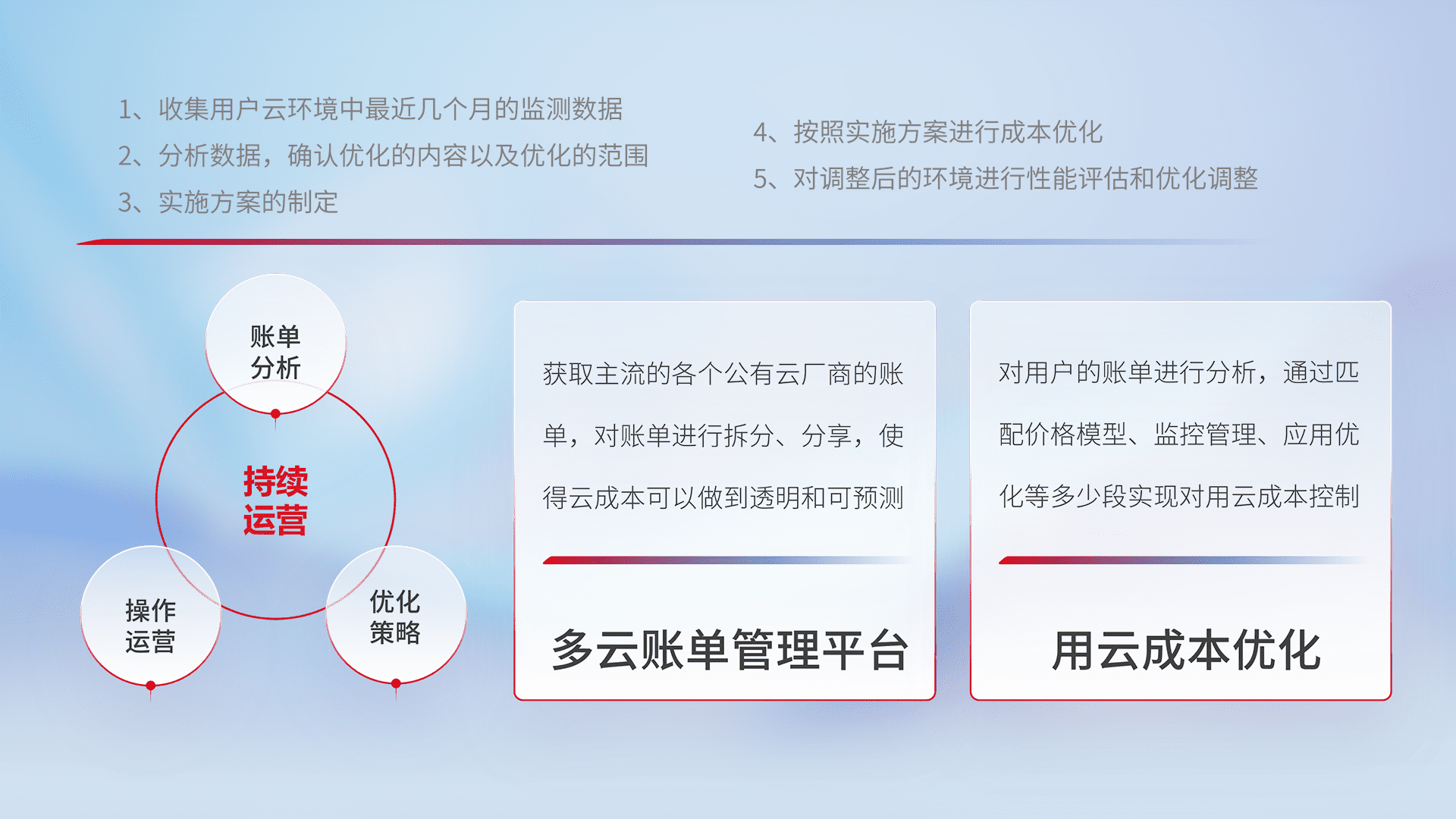 通过多云纳管,,,以统一的资源数据模型把客户的云资源进行抽象和封装,,进而实现对多云资源的统一操作,,,保障云资源管理的可靠性、、稳定性与可用性。。。量身定制化运维内容,,,,配置、、、、开发运维、、补丁管理、、备份、、、监控、、认证和访问管理、、、、审计和日常巡检等,,,保障在用云过程中的可靠度,,,稳定度以及高可用率。。。